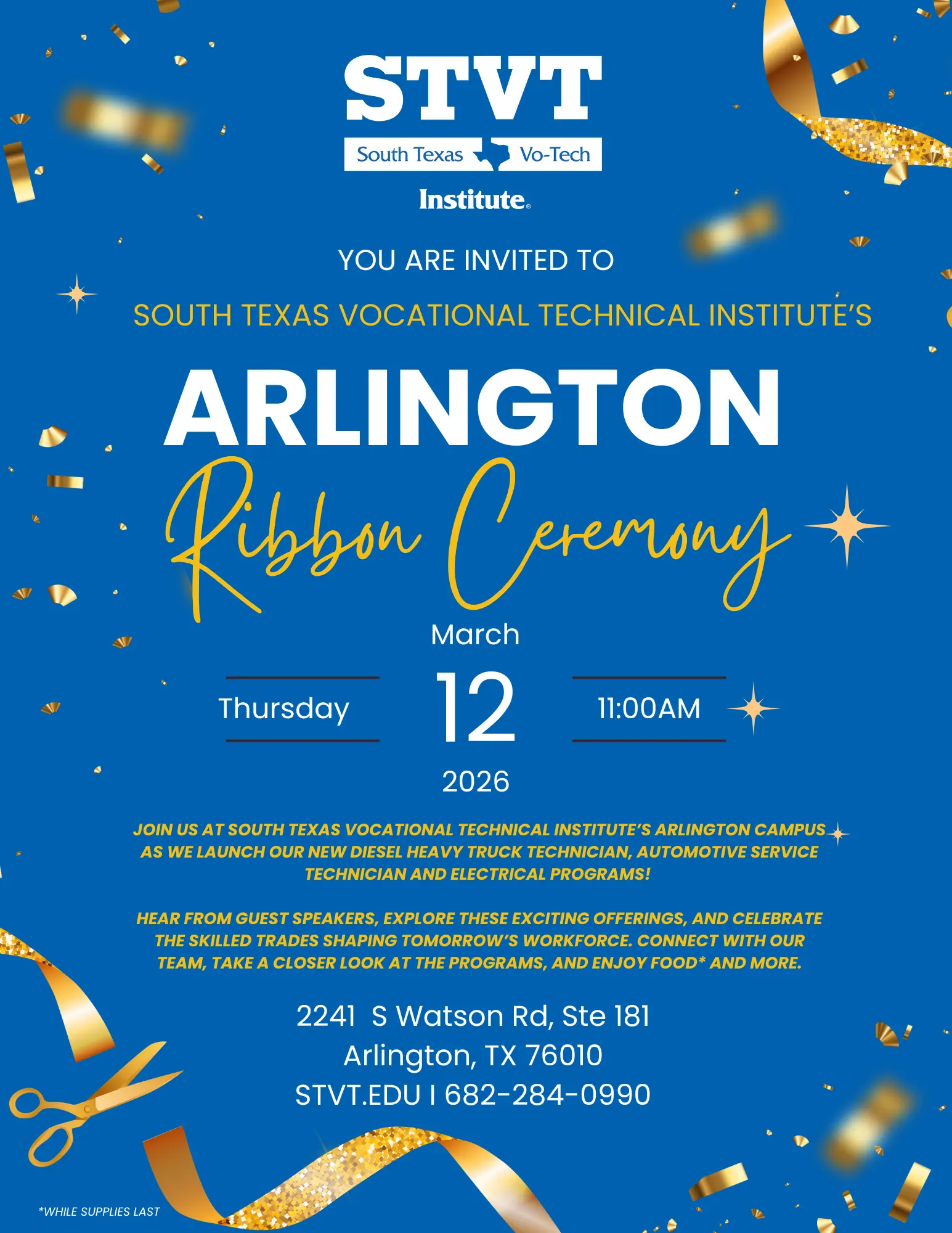 Join South Texas Vocational Technical Institute (STVT) for our Arlington Ribbon Cutting Ceremony on Thursday, March 12, 2026 at 11:00 AM as we celebrate the launch of our new Diesel Heavy Truck Technician, Automotive Service Technician, and Electrical programs.